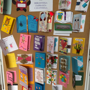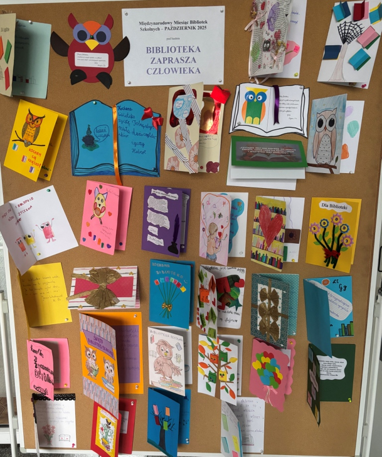 Październik to Międzynarodowy Miesiąc Bibliotek Szkolnych. W tym roku obchodzony był pod hasłem „Biblioteka zaprasza człowieka”. Z tej okazji zorganizowany został w naszej bibliotece szkolnej konkurs na kartę i życzenia dla biblioteki. Uczniowie wykazali się kreatywnością zarówno w przygotowaniu kartek jak i napisaniu życzeń. W bibliotece został przygotowany kącik z nowościami czytelniczymi. Odbyły się zajęcia biblioteczne dla klas pierwszych, podczas których uczniowie dowiedzieli się jak powstaje książka oraz jak funkcjonuje biblioteka szkolna.
