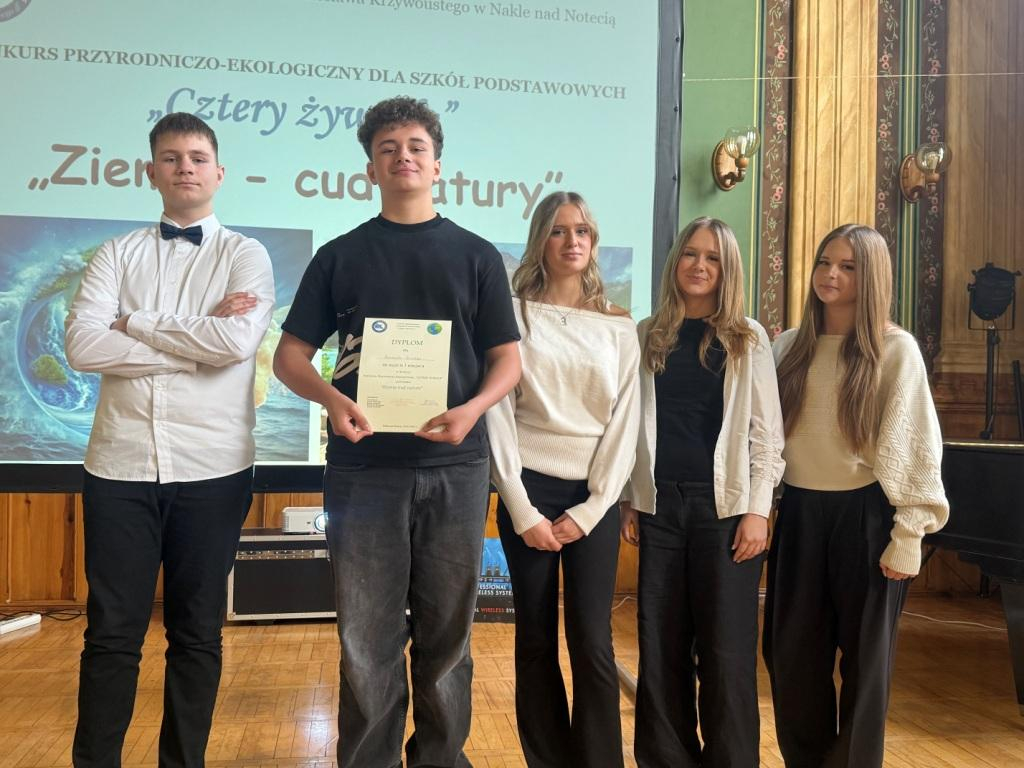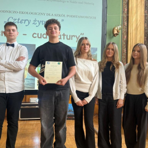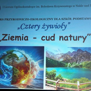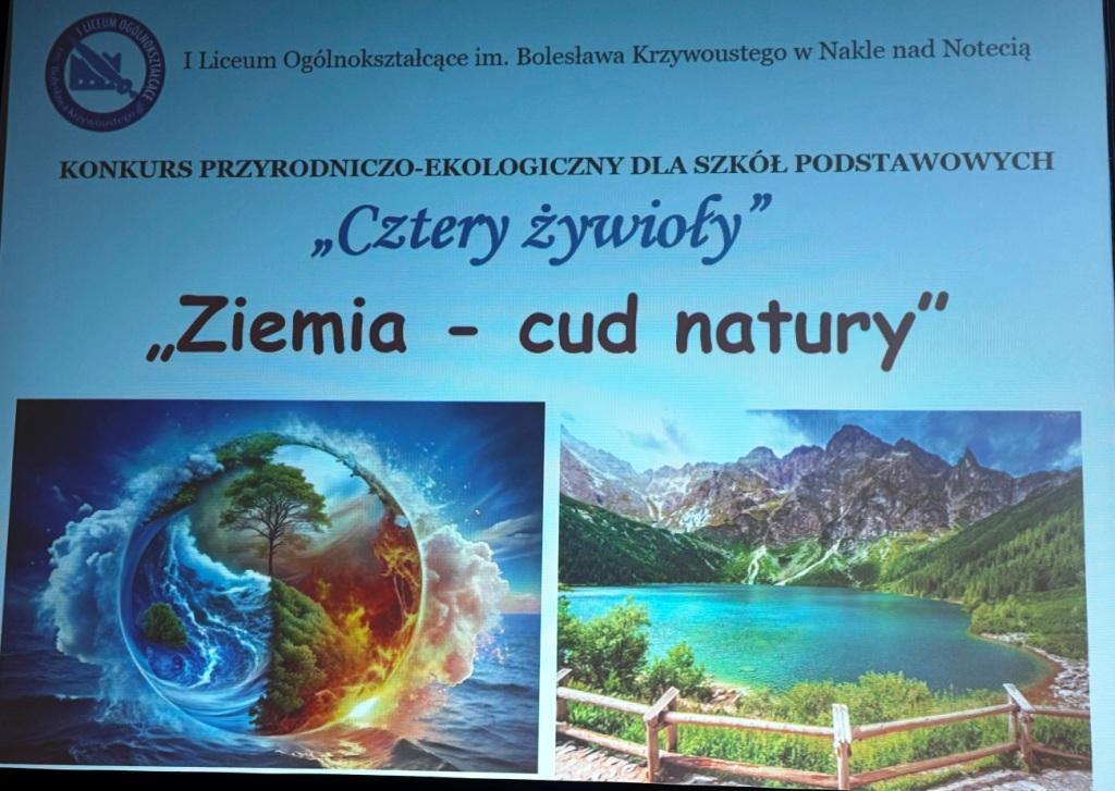 W poniedziałek 23 marca 2026 r. reprezentacja naszej szkoły w składzie: Maja Deja, Nadia Wika, Emilia Zbieralska, Maksymilian Soczka i Konrad Zmarlik, uczestniczyła w Konkursie Przyrodniczo – Ekologicznym pod nazwą „Cztery Żywioły”. Tematem przewodnim tegorocznej, XI edycji tego konkursu była: „Ziemia – cud natury”. Organizatorem tego wydarzenia od wielu lat jest I Liceum Ogólnokształcące w Nakle nad Notecią pod honorowym patronatem Starosty Nakielskiego. Konkurs ten jest szeroką formą popularyzacji wśród uczniów szkól podstawowych nauk przyrodniczych: biologii, geografii, fizyki oraz chemii.