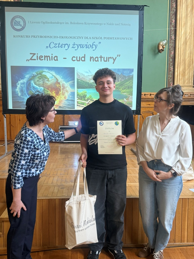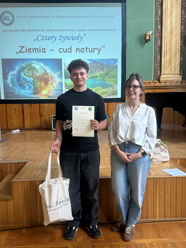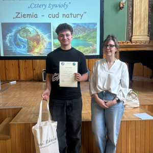 Nasi reprezentanci wykazali się dużą wiedzą, zaangażowaniem oraz kreatywnością w zgłębianiu tajników niełatwej wiedzy przyrodniczej. Szczególnym osiągnięciem dla naszej szkoły jest zdobycie I miejsca przez Konrada Zmarlika, ucznia klasy ósmej, który w wyjątkowy sposób zaprezentował swoje umiejętności i wiedzę na temat Ziemi i ochrony jej przyrody. Słowa uznania należą się również Nadii Wika, która wywalczyła sobie czwartą lokatę w tym konkursie.