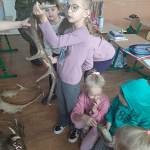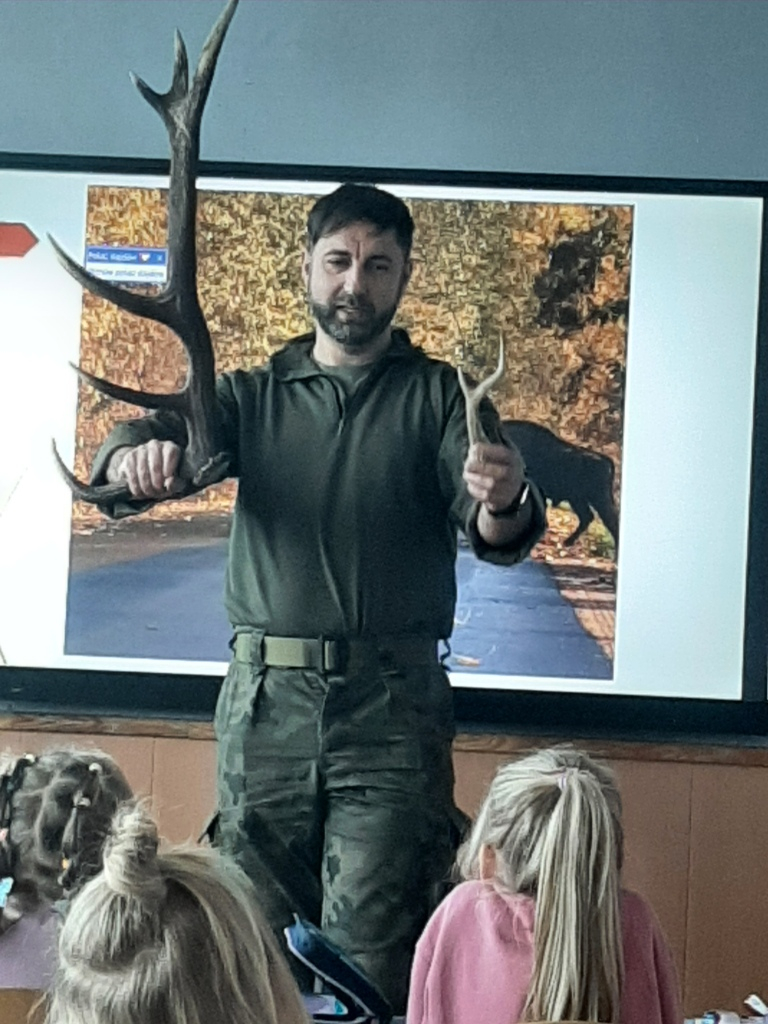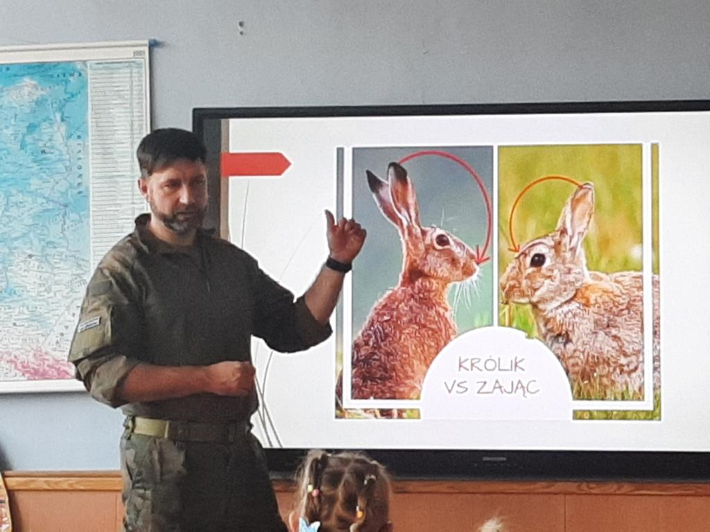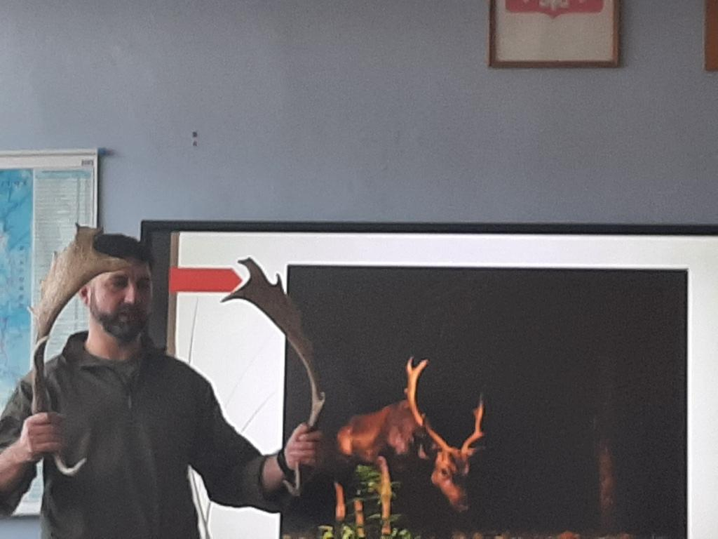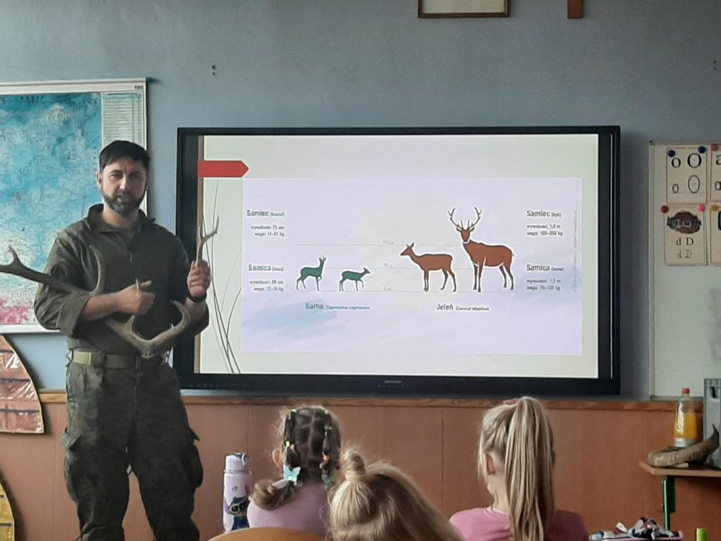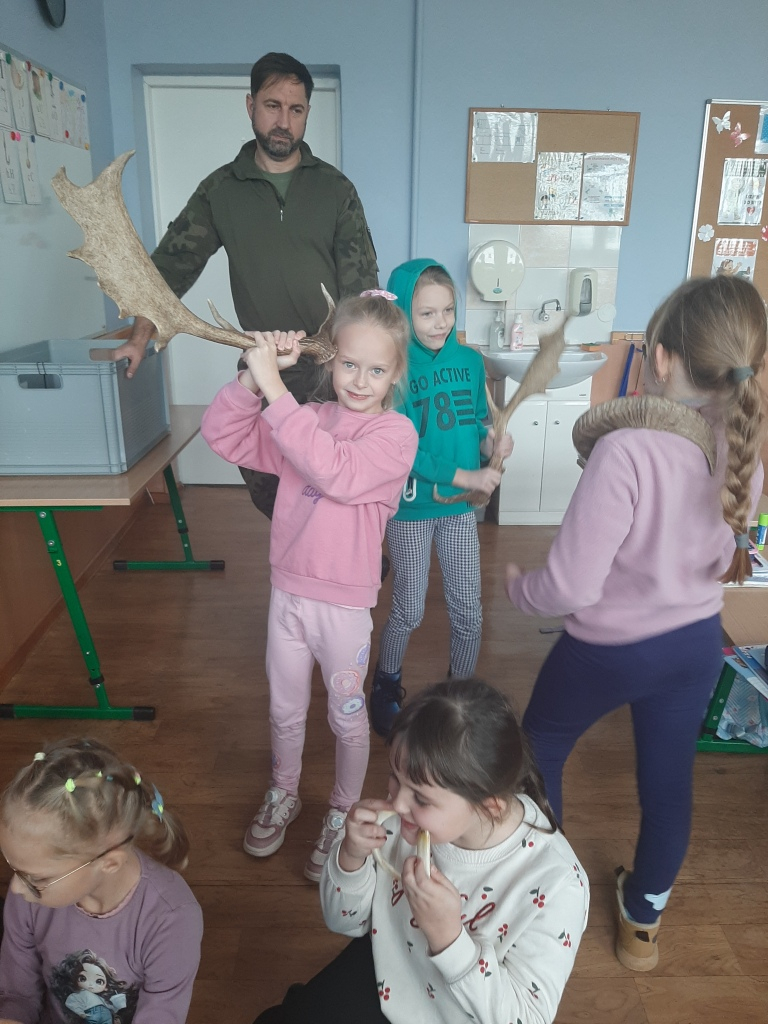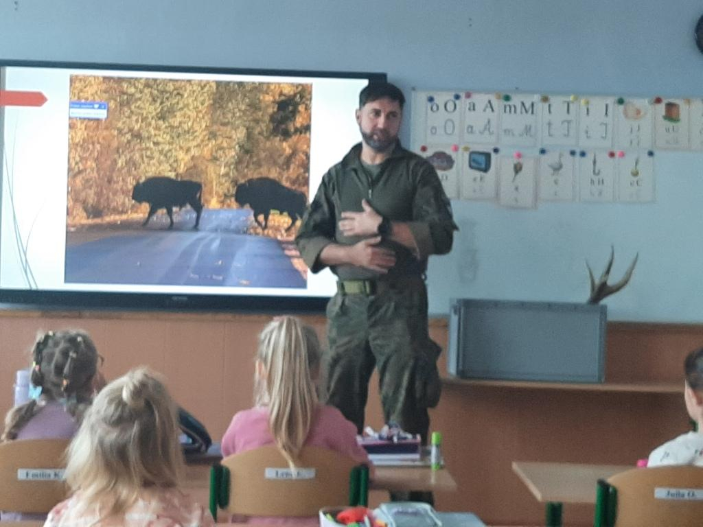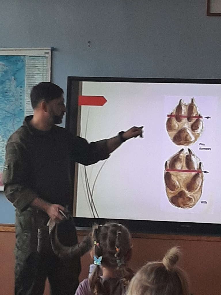 Pan Tomasz bardzo ciekawie opowiadał o zwierzętach żyjących w polskich lasach. Dzieci mogły obejrzeć zdjęcia, filmy, poroża i rogi różnych zwierząt. Dowiedziały się, jakie gatunki można spotkać w naszych lasach i jak je rozpoznać po wyglądzie, odgłosach i śladach. Gość przekazał wiele ciekawych informacji i nauczył wielu nowych nazw przyrodniczych. Pokazał nagrania z fotopułapek oraz zrobione przez siebie zdjęcia. Niektóre zachowania i odgłosy zwierząt zaskoczyły uczniów. Na koniec spotkania było mnóstwo pytań. Dzieci z dużym zainteresowaniem słuchały opowieści i czekają z niecierpliwością na kolejne spotkanie.