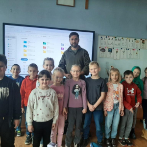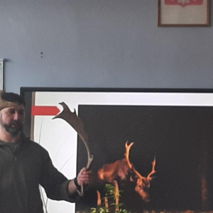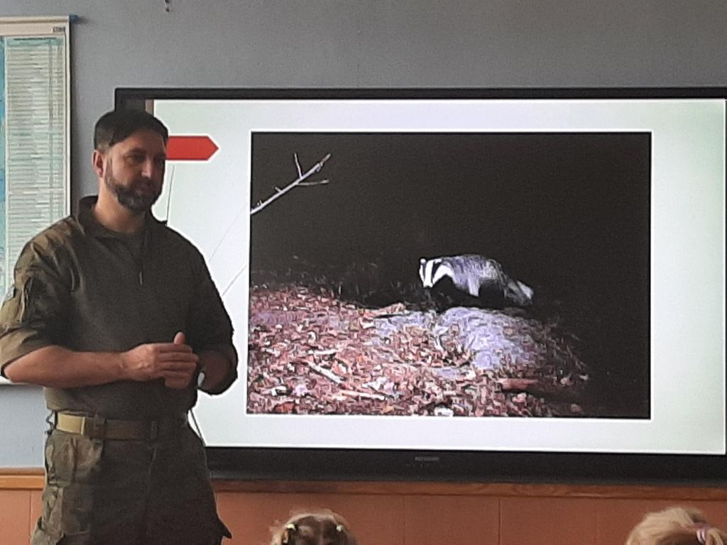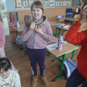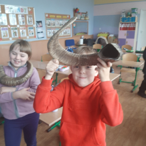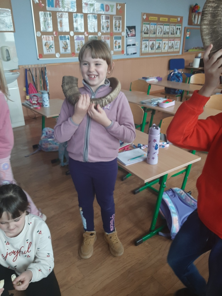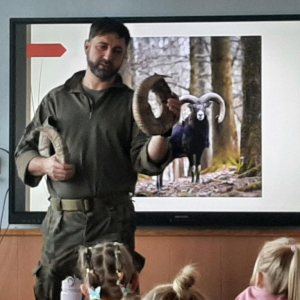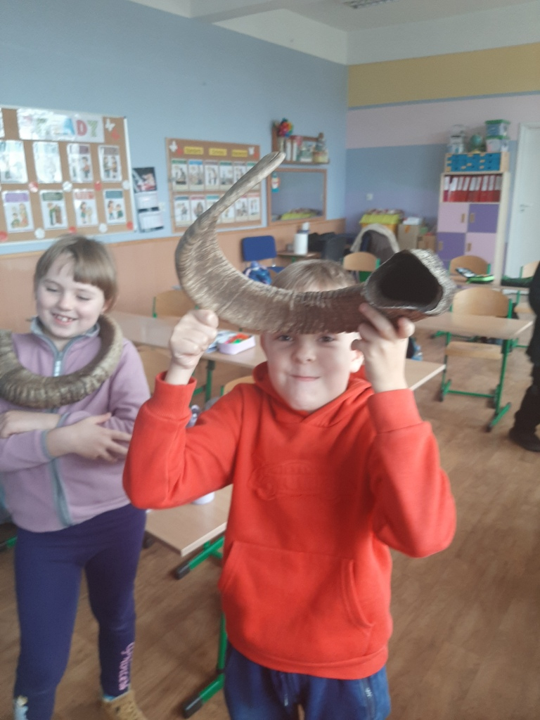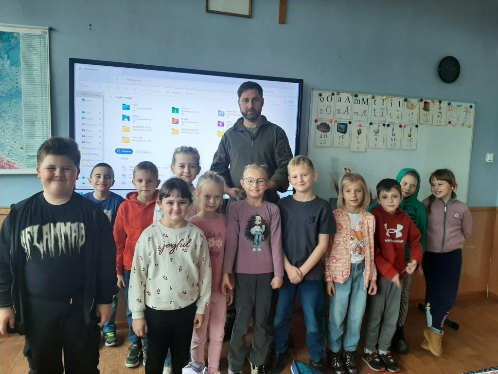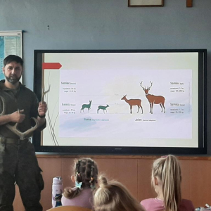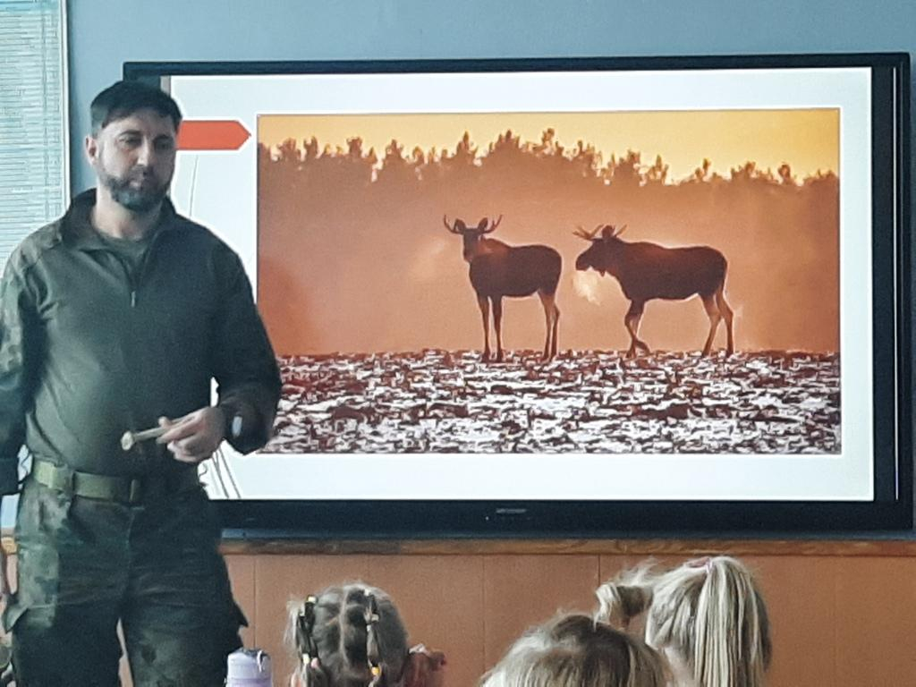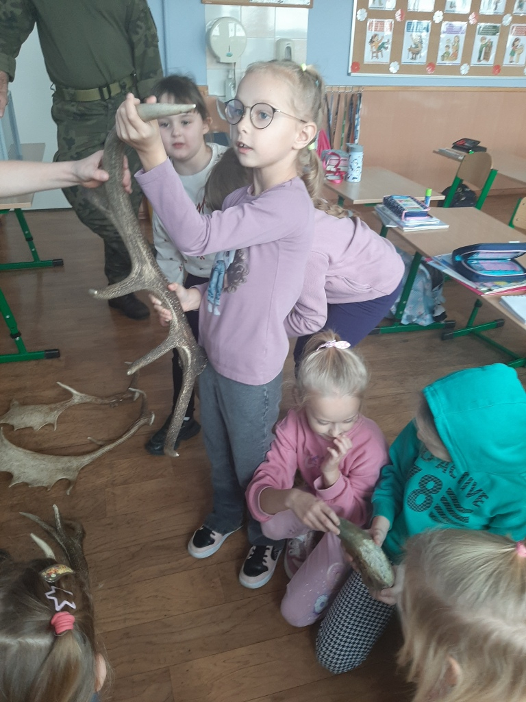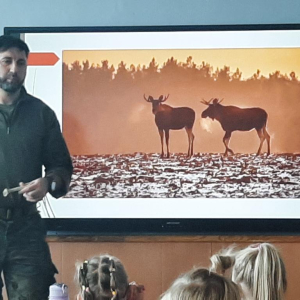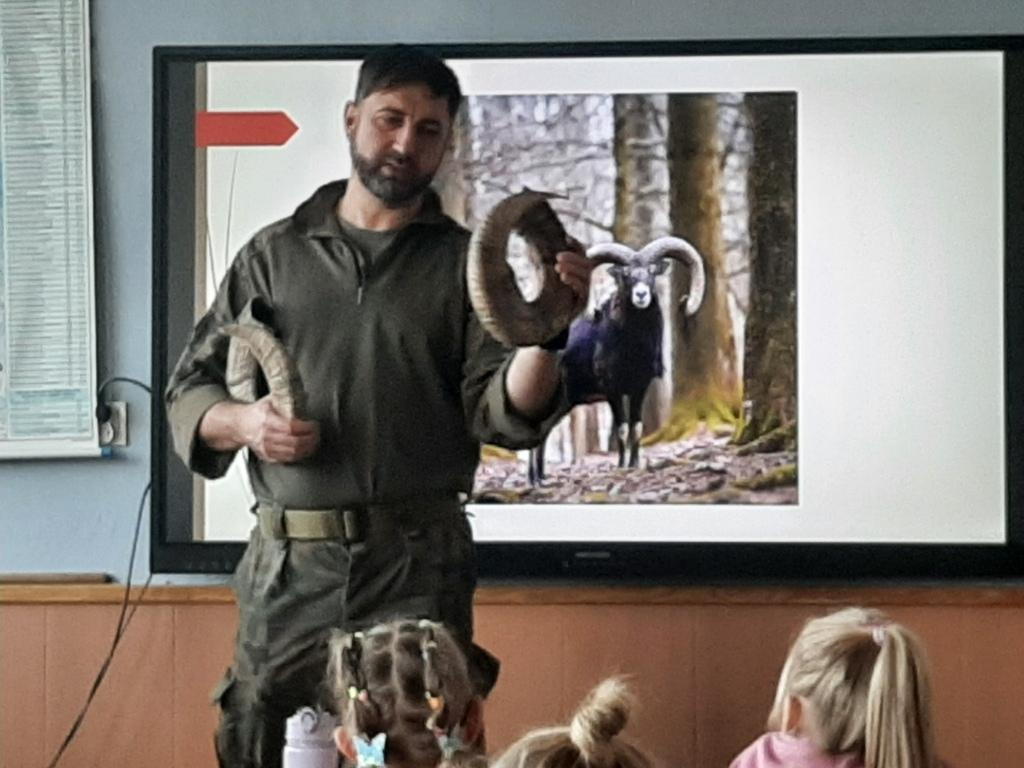 Pan Tomasz bardzo ciekawie opowiadał o zwierzętach żyjących w polskich lasach. Dzieci mogły obejrzeć zdjęcia, filmy, poroża i rogi różnych zwierząt. Dowiedziały się, jakie gatunki można spotkać w naszych lasach i jak je rozpoznać po wyglądzie, odgłosach i śladach. Gość przekazał wiele ciekawych informacji i nauczył wielu nowych nazw przyrodniczych. Pokazał nagrania z fotopułapek oraz zrobione przez siebie zdjęcia. Niektóre zachowania i odgłosy zwierząt zaskoczyły uczniów. Na koniec spotkania było mnóstwo pytań. Dzieci z dużym zainteresowaniem słuchały opowieści i czekają z niecierpliwością na kolejne spotkanie.