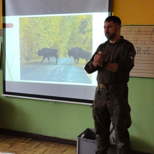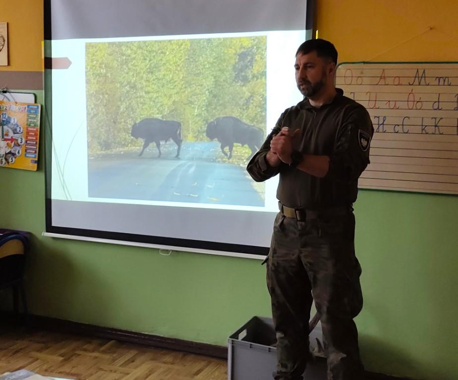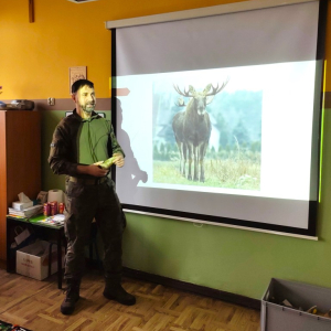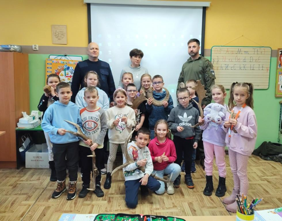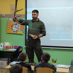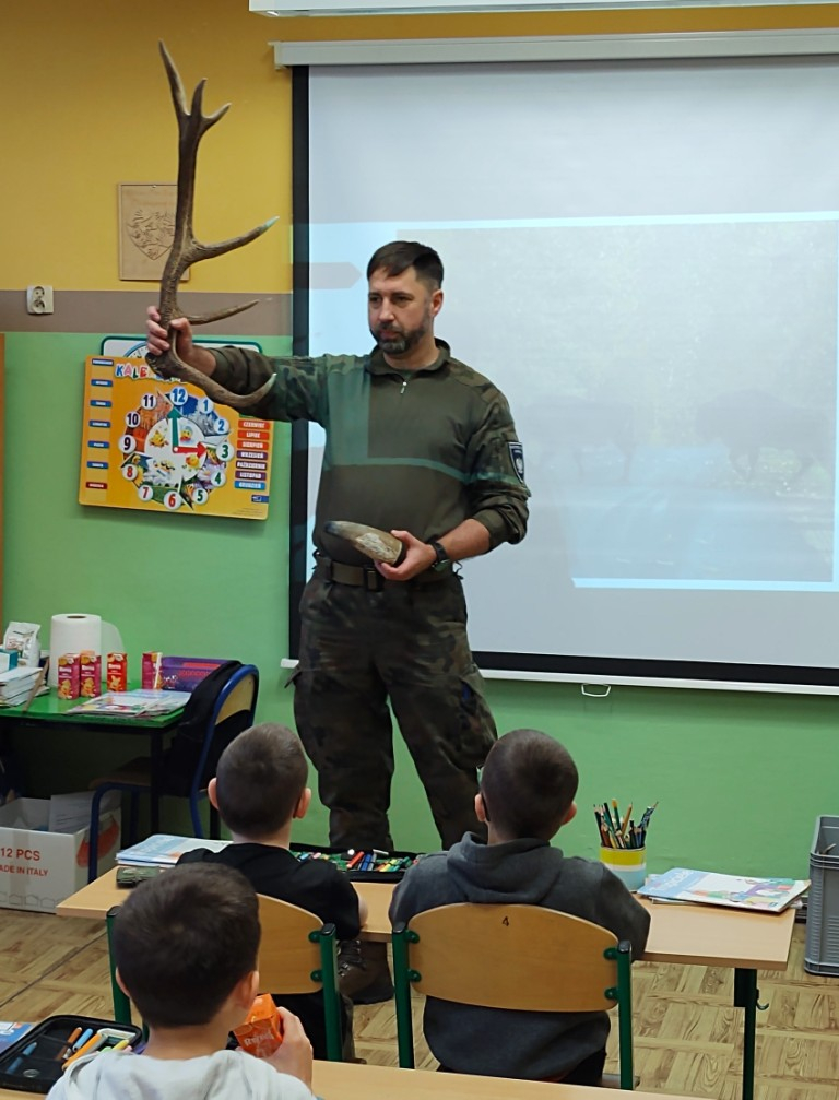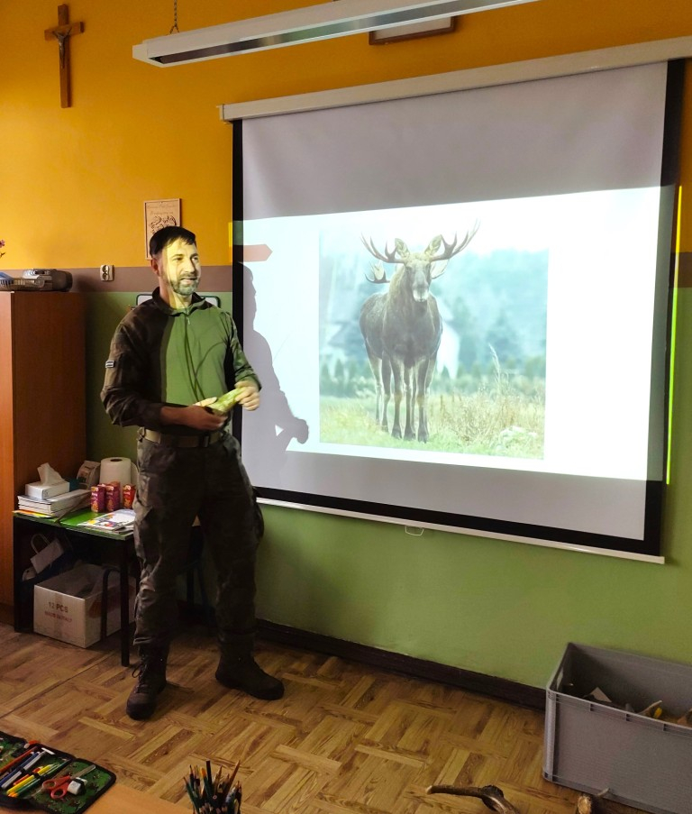 Pan Tomasz przekazał dzieciom wiele ciekawych informacji dotyczących zwierząt żyjących w polskich lasach. Pokazał nagrania z fotopułapek, zrobione przez siebie zdjęcia oraz poroża i rogi różnych zwierząt. Dzieci z dużym zainteresowaniem słuchały opowieści, a na koniec zadawały mnóstwo pytań.