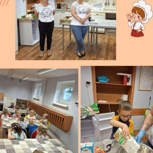 Dnia 16.05.2025 r. w naszej przedszkolnej grupie odbyły się wyjątkowe warsztaty kulinarne, które poprowadziły Panie z Koła Gospodyń Wiejskich ,,Bławatki”, będące jednocześnie mamami dwójki naszych przedszkolaków. Spotkanie było nie tylko okazją do wspólnej zabawy, ale także do nauki i integracji całej grupy. Panie opowiedziały o działalności KGW i tradycjach kulinarnych. Tematem przewodnim warsztatów było przygotowanie pysznych naleśników. Dzieci z ogromnym zainteresowaniem obserwowały, jak powstaje ciasto, a następnie aktywnie uczestniczyły w mieszaniu składników, smarowaniu naleśników różnymi dodatkami oraz ich dekorowaniu. Było mnóstwo śmiechu, ciekawych rozmów i oczywiście – smakowania! Dzięki zaangażowaniu naszych gości dzieci mogły poczuć się jak mali kucharze, a przy okazji dowiedzieć się, jak ważna jest współpraca, cierpliwość i radość z tworzenia czegoś wspólnie. Atmosfera była domowa i serdeczna, a zapach naleśników unosił się po korytarzach szkoły. Na zakończenie spotkania czekała na dzieci niespodzianka w postaci baniek mydlanych, które wywołały uśmiechy na twarzach - dzieci biegały, śmiały się i łapały z zachwytem. Przedszkolaki otrzymały również słodki upominek, który sprawił mi ogromną radość.